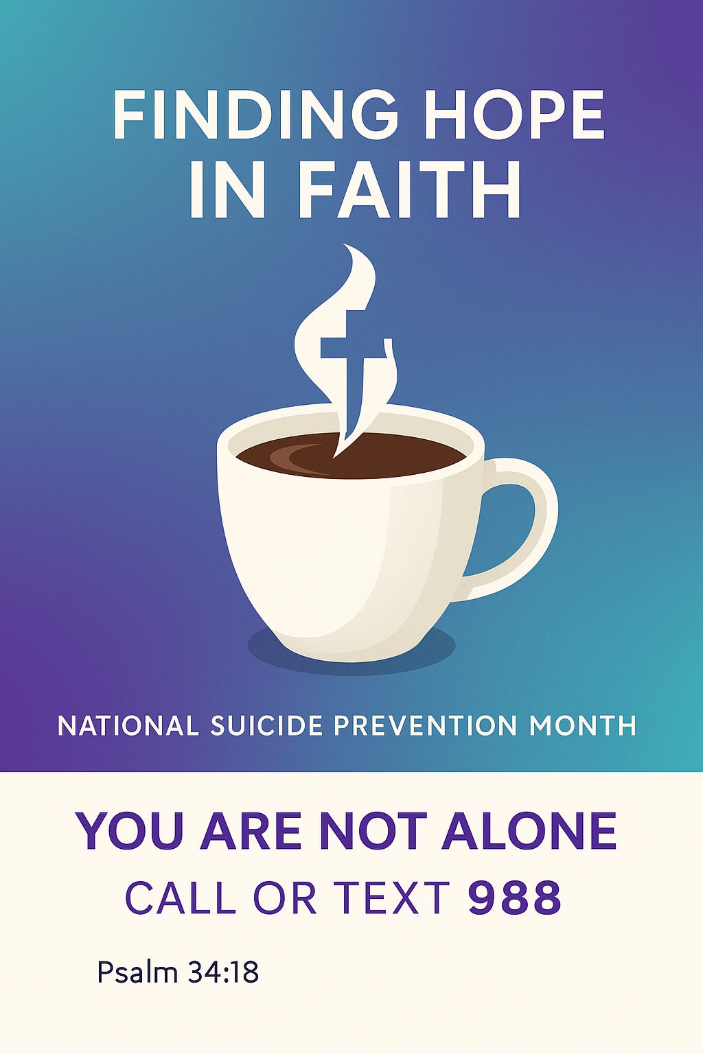 As we step into National Suicide Prevention Month this September 2025, we’re called to a sacred mission: to shine a light on the darkness of despair and offer hope through faith and connection. This year, our campaign, “Beyond the 12, Jesus & a Cup of Joe,” invites us to extend Christ’s love beyond our inner circles—beyond the twelve disciples, beyond our comfort zones—and into the lives of those who need it most. Over a simple cup of coffee, we can start conversations that save lives. This week, September 1–5, our theme is Finding Hope in Faith. We’ll explore how scripture, stories of resilience, and the 988 Suicide & Crisis Lifeline can guide us toward healing and hope.